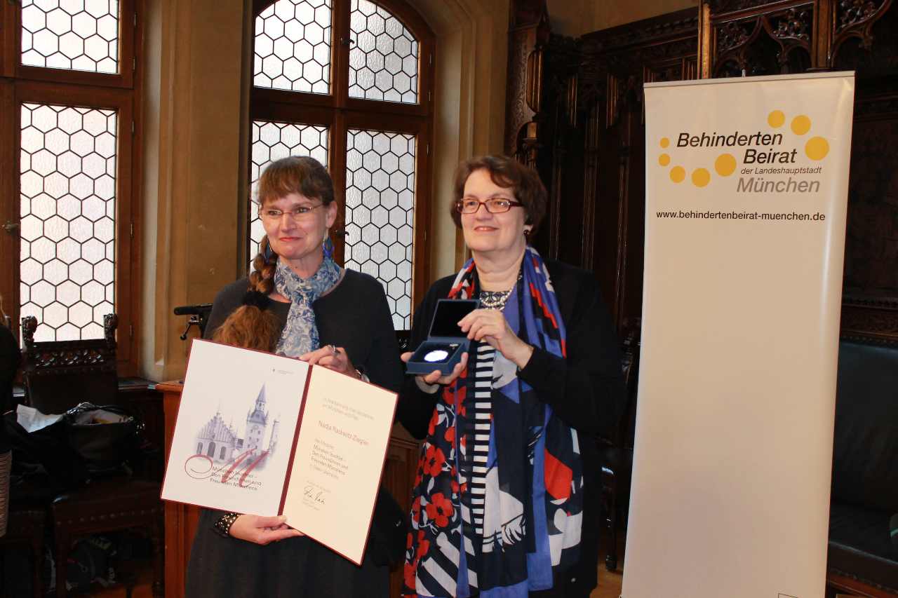 "Im Rahmen des Neujahrsempfangs des Behindertenbeirats der Landeshauptstadt München im Kleinen Sitzungssaal des Rathauses hat Bürgermeisterin Christine Strobl der Vorsitzenden des Gremiums, Nadja Rackwitz-Ziegler, jetzt die Medaille „München leuchtet – Den Freundinnen und Freunden Münchens“ in Silber überreicht. Rackwitz-Ziegler habe sich mit ihrem großen ehrenamtlichen Engagement in der Behindertenarbeit herausragende Verdienste um die Inklusion von Menschen mit Behinderung erworben, betonte Strobl bei der Übergabe der Medaille."